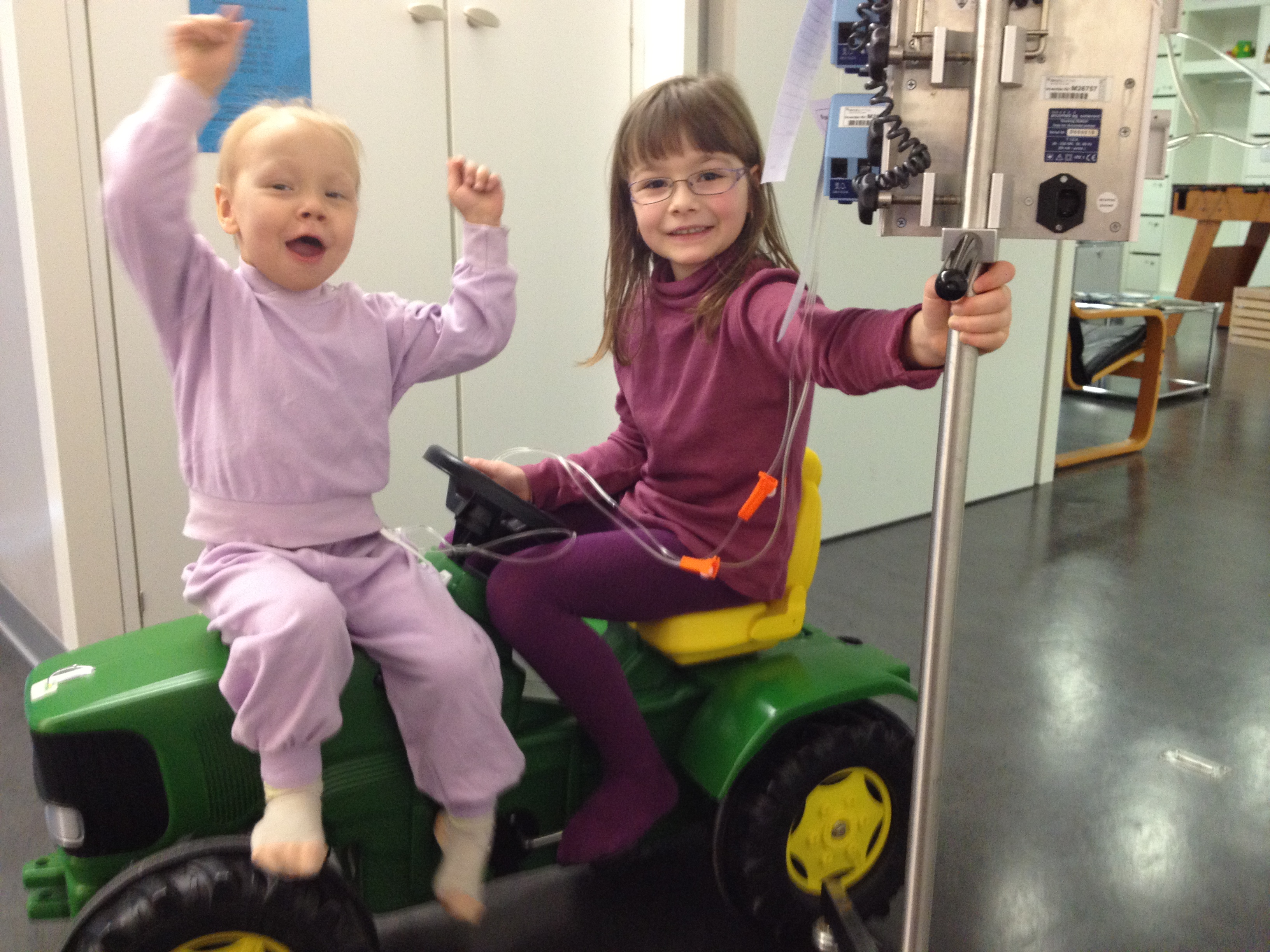Samedi et dimanche mon mari et Lana sont venus passer le w.e ici à Berne. Ils ont pu dormir dans la maison Ronald Mac Donald. Nous avons pris les repas ensemble et vu que Zoé n’était pas en isolement, les filles ont pu profiter des couloirs pour jouer ensemble. Avec les camions vélos et autre on a fait des courses, il y avait aussi beaucoup à faire à la salle de jeux. Zoé était en grande forme et heureuse de voir son papa et sa grande sœur.
